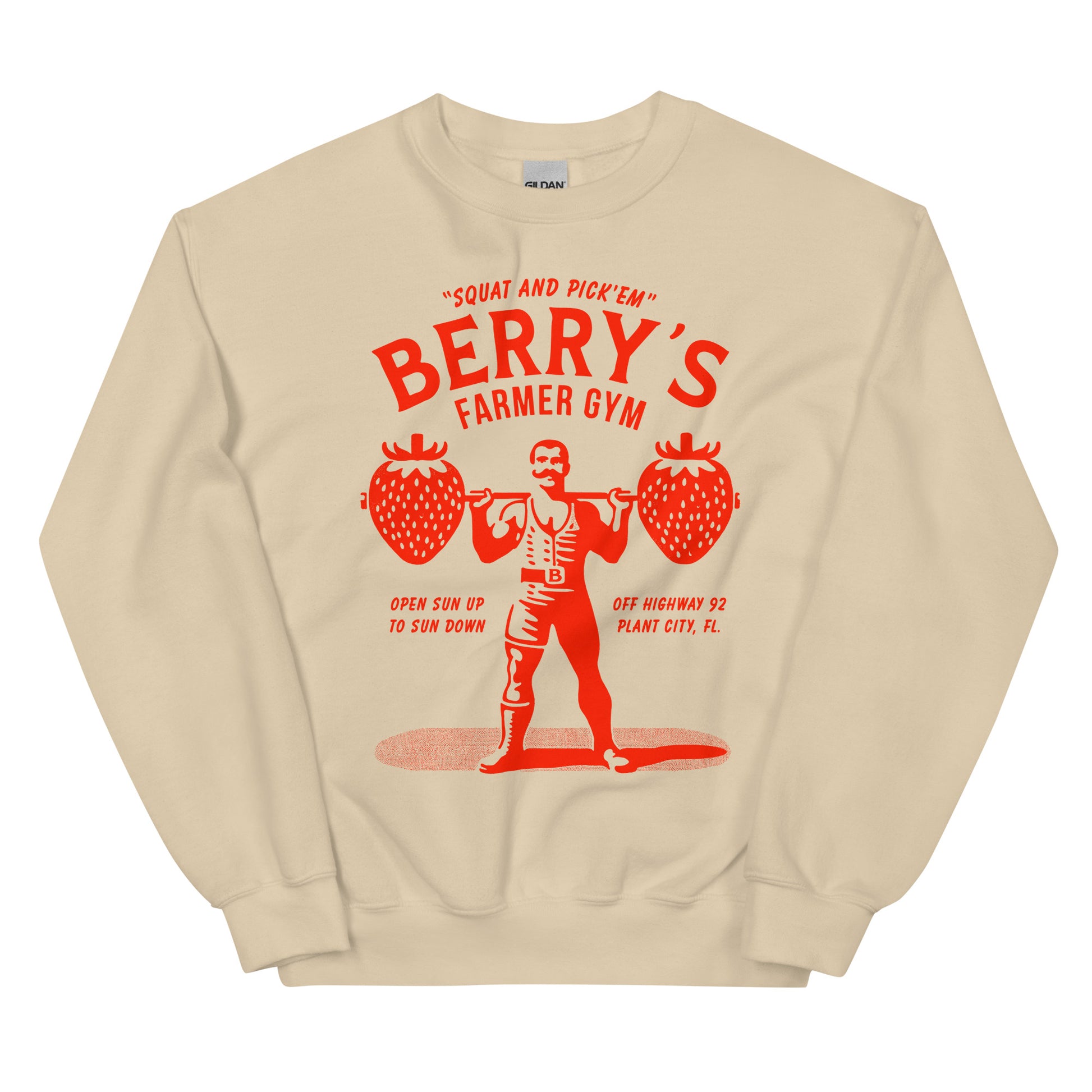 Introducing the Berry's Farmer Gym Sweatshirt – a bold nod to small-town hustle, hard work, and the strawberry legacy of Plant City, Florida. This isn’t just apparel; it’s a tribute to the grit of the farmers who’ve made this town the Winter Strawberry Capital of the U.S. For over 100 years, Plant City’s fields have produced 20% of America’s strawberries, powering a $1.1 billion industry with every sunrise harvest. Wear this with pride – it’s small-town strength stitched into every fiber, perfect for the gym, a run, or a laid-back day out.